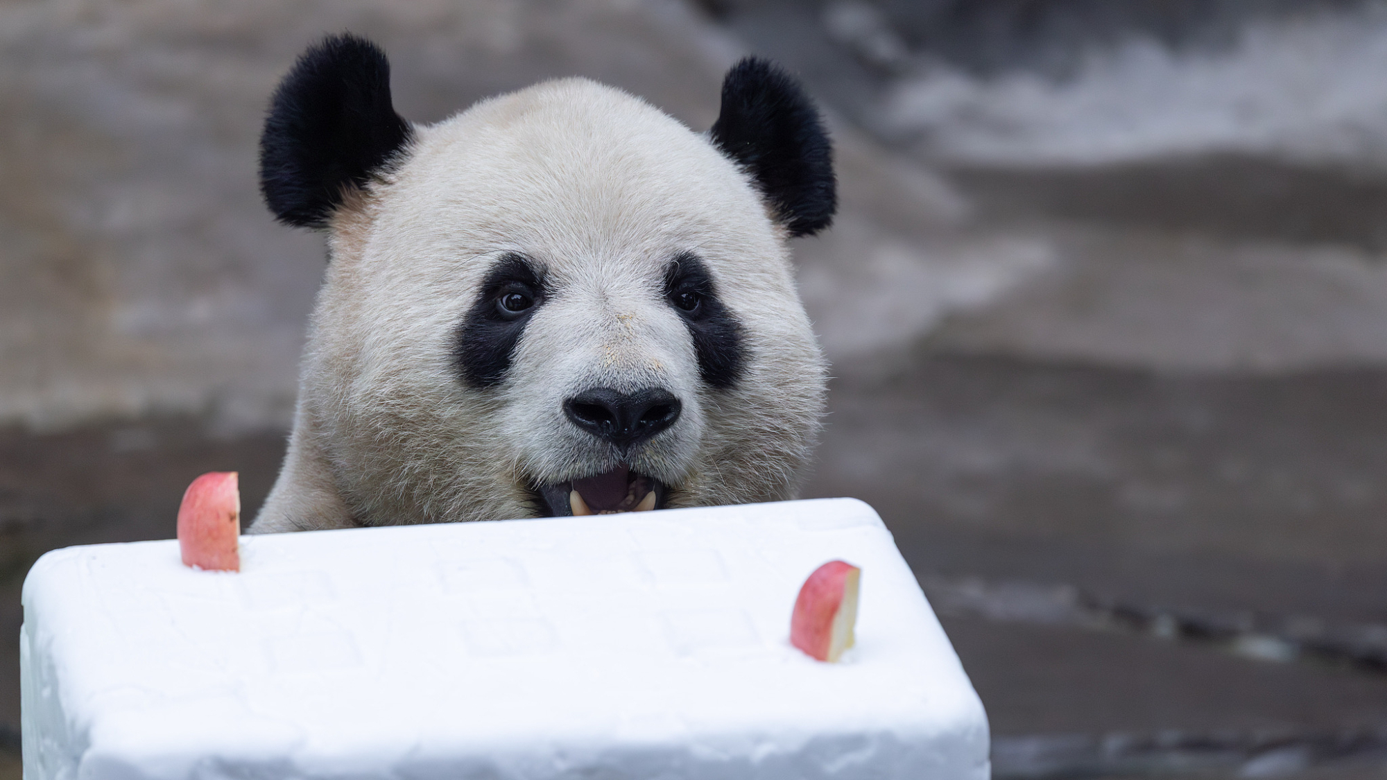 Chongqing: i panda giganti giocano con palle di neve e gustano un ricco pasto